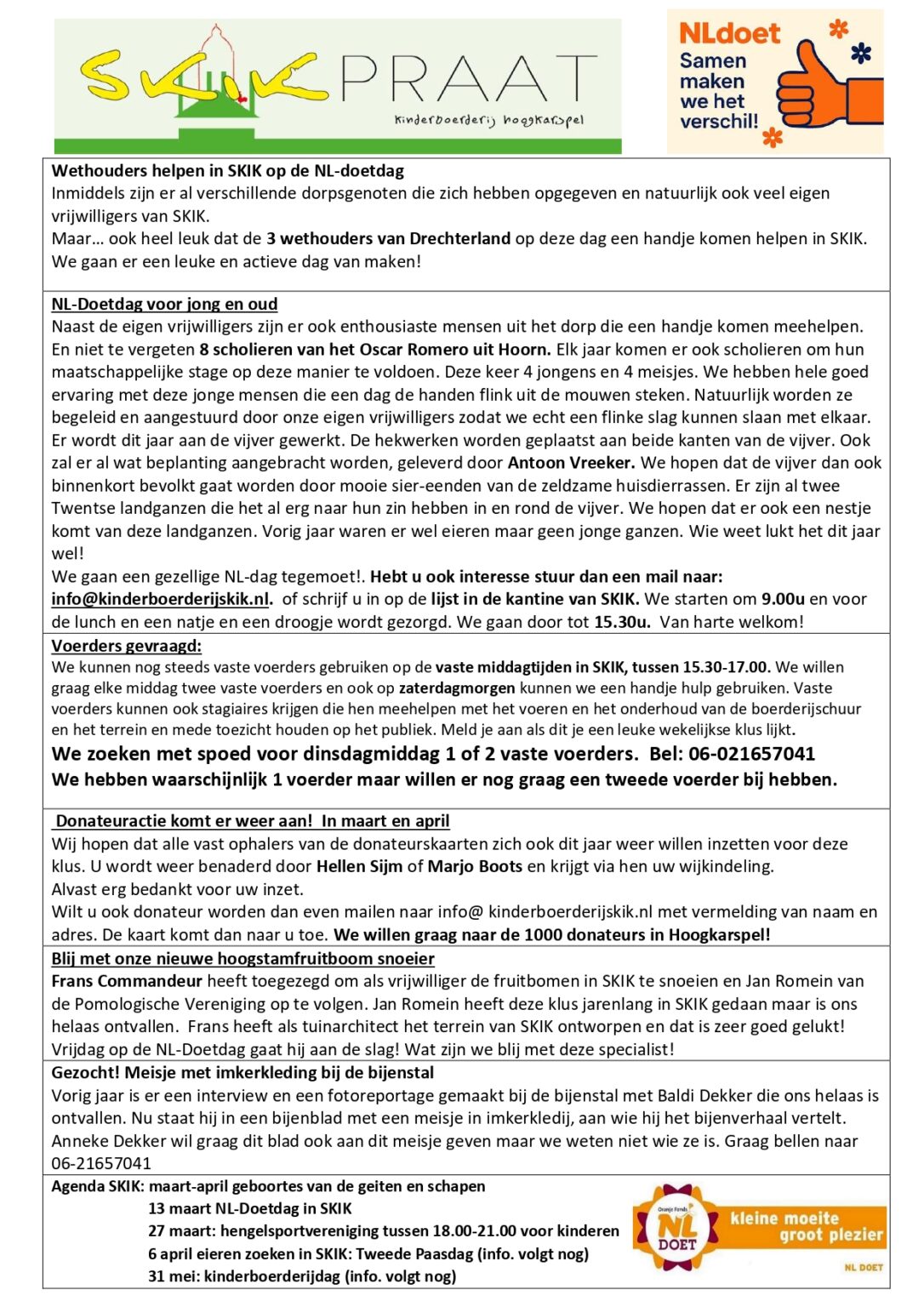 Wethouders helpen tijdens de NL-Doetdag; NL-Doetdag voor jong en oud; Voerders gevraagd; Donateursactie; Nieuwe hoogstamfruit snoeier