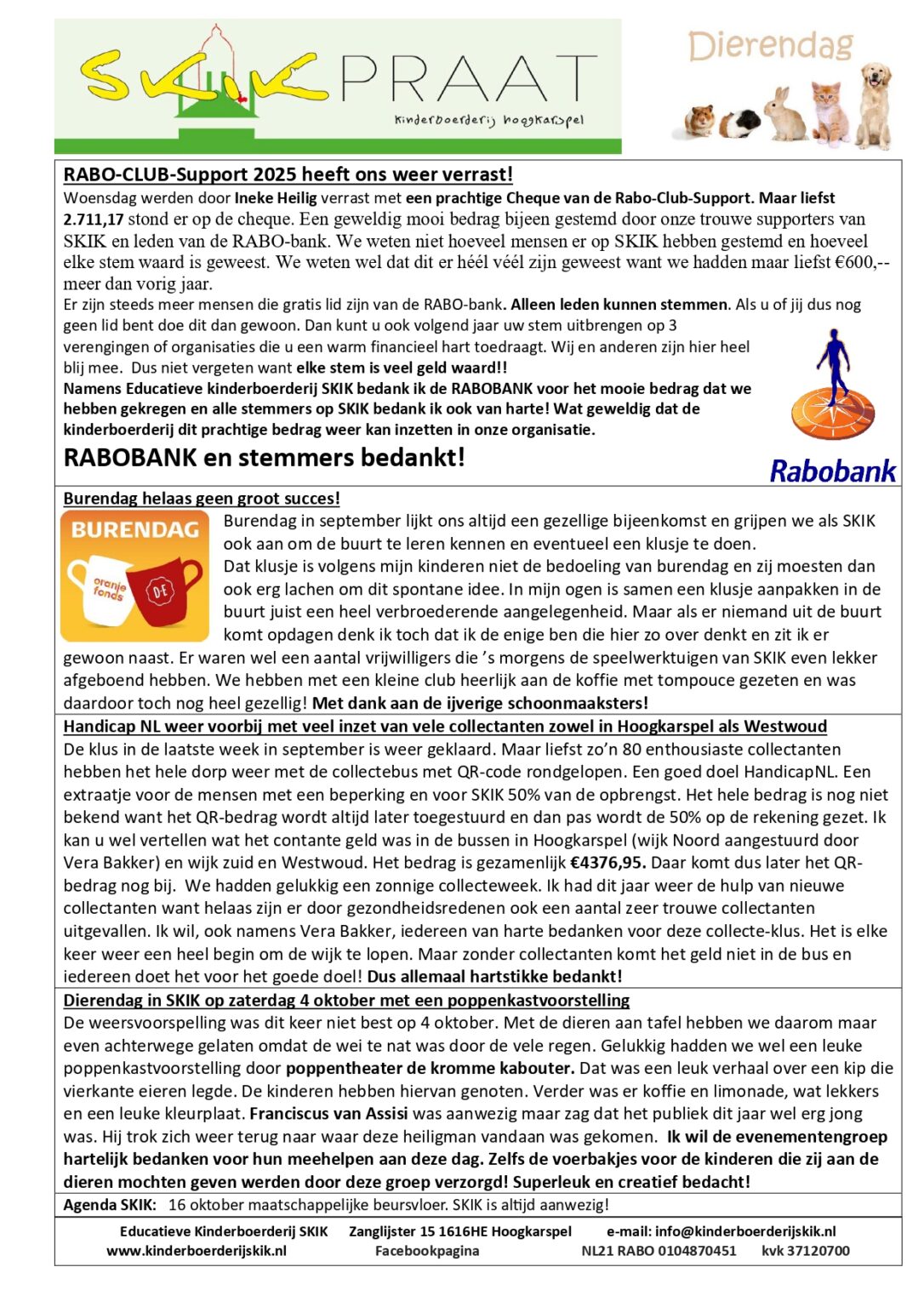RABO ClubSupport heeft ons weer verrast; Burendag helaas geen groot succes; Collecte HandicapNL; Terugblik Dierendag 4 oktober