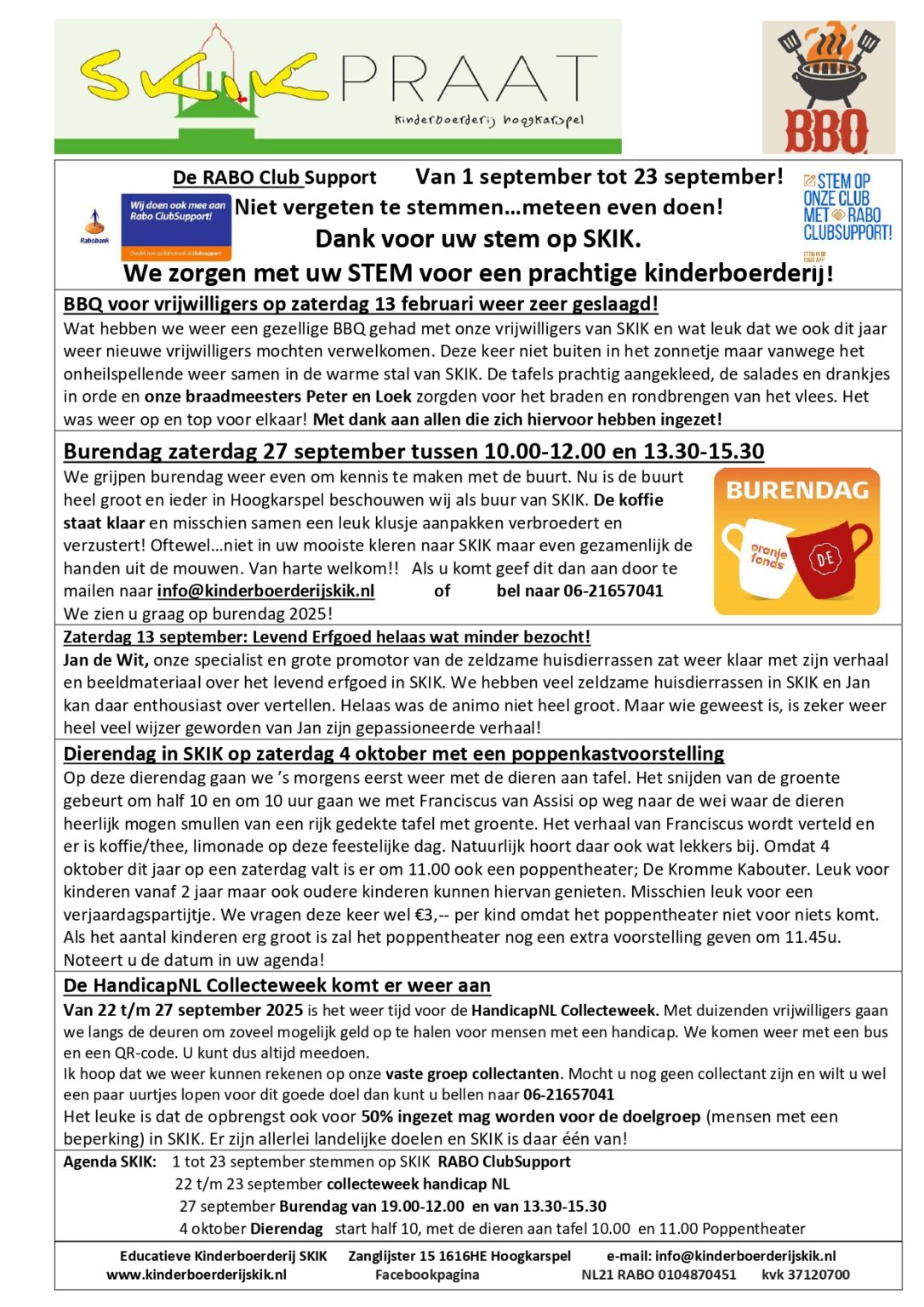 Rabo ClubSupport; BBQ vrijwilligers zeer geslaagd; Burendag 27 september; Levend Erfgoeddag; Dierendag 4 oktober; Handicap NL collecteweek