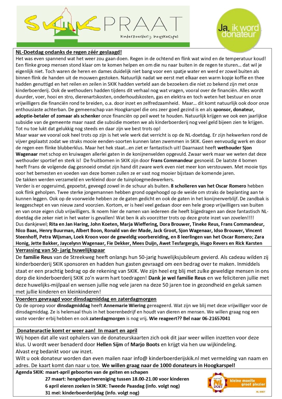 NL-Doetdag ondanks regen zeer geslaagd; Verrassing van 50-jarig huwelijkspaar; Voerders gevraagd; Donateursactie